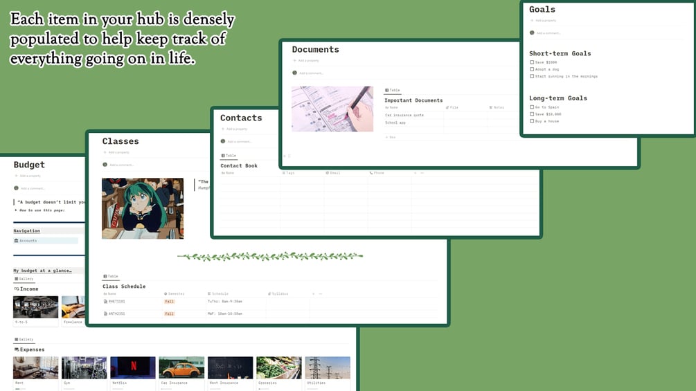 A dashboard is quite a bit heftier than a normal template. It's a one-stop shop for anything you want to write down, document, track, etc. They usually also have a fun theme that runs throughout the entire dashboard making the design cohesive and pleasing. Most dashboards have journals, budgeting help, and habit trackers, but there is typically tons more included! đ