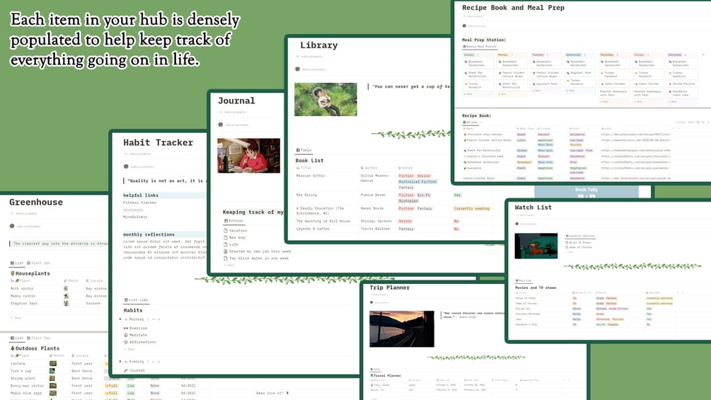 A dashboard is quite a bit heftier than a normal template. It's a one-stop shop for anything you want to write down, document, track, etc. They usually also have a fun theme that runs throughout the entire dashboard making the design cohesive and pleasing. Most dashboards have journals, budgeting help, and habit trackers, but there is typically tons more included! đ
