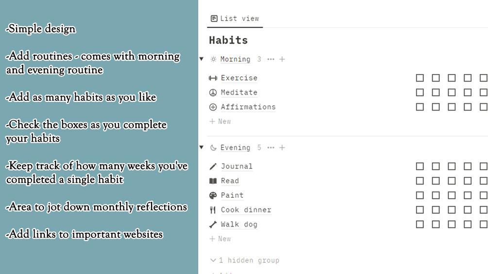 A soothing habit tracker Notion template to keep all of your daily tasks in one place. Tick off an item each day of the week until you complete the week, then add it to the tally of completed weeks. You can see where you thrive and where you may have some improvements to make.